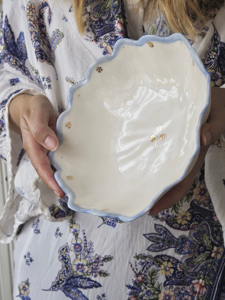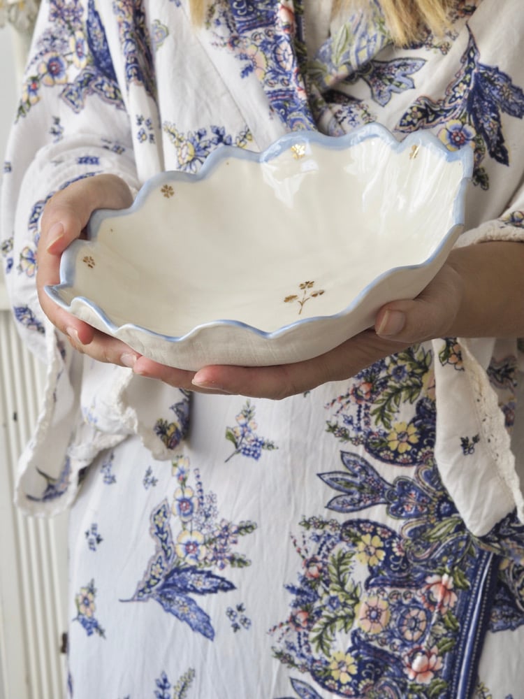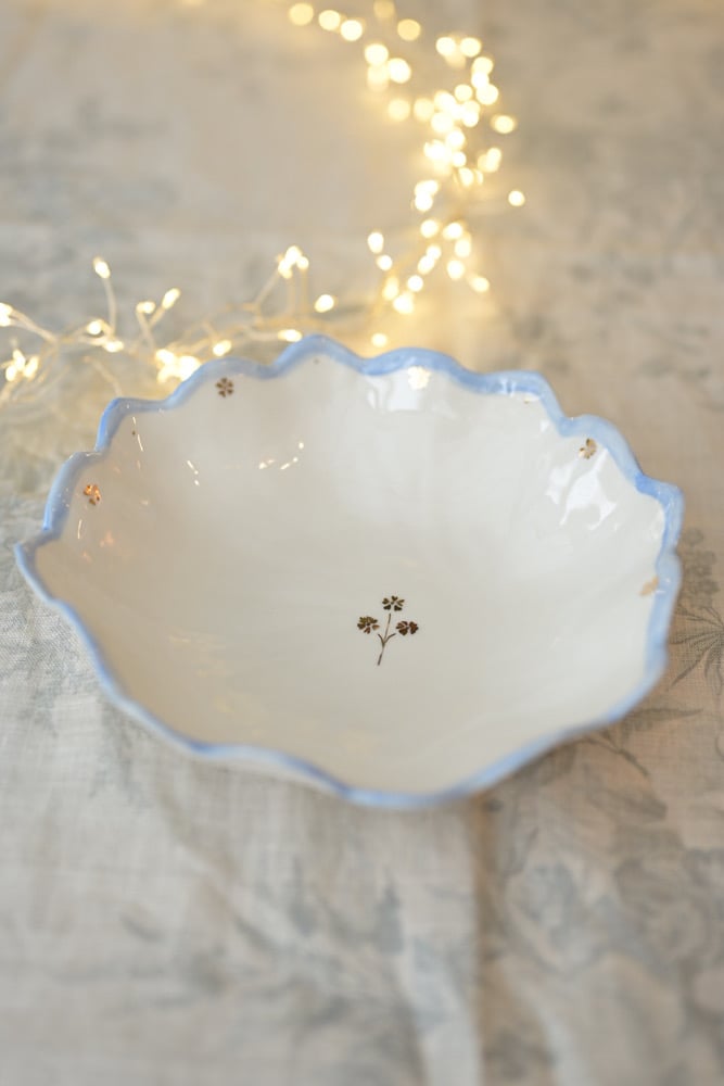 Large wavy bowl made from porcelain, hand painted gold forget-me-nots and finished with a pale blue painted stripe. A one off piece.
