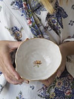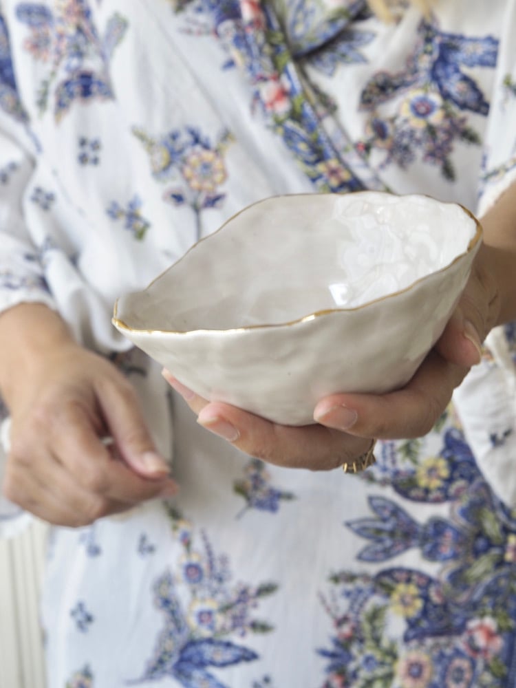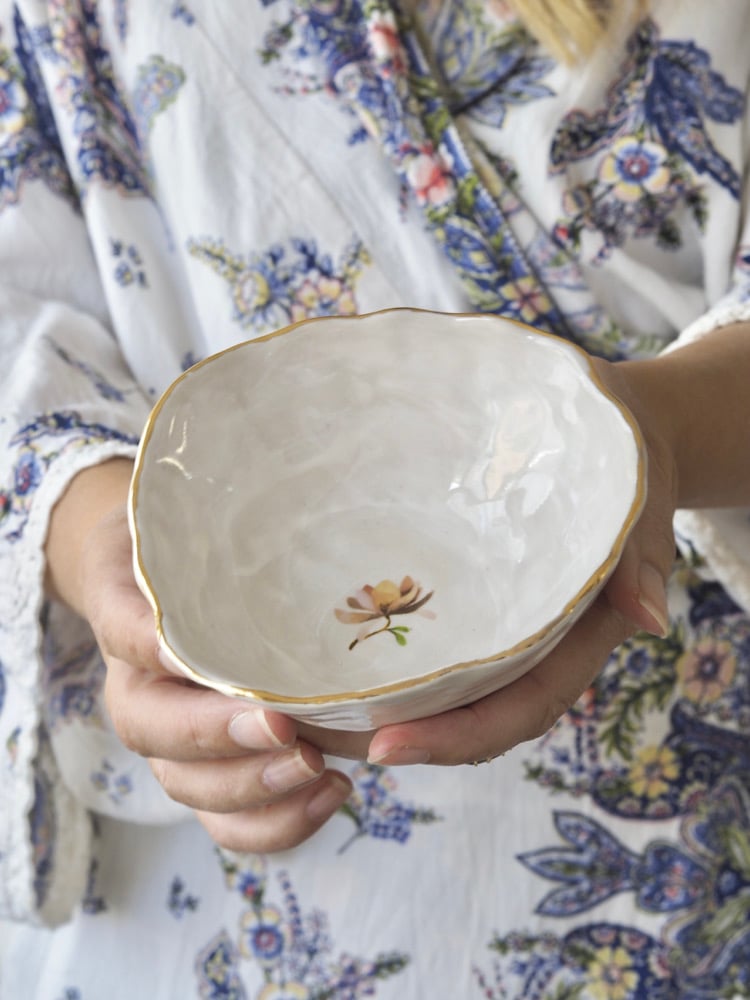 Wavy bowl perfect for yogurt or berries, but also would make a lovely tea light holder.. Made from stoneware, it has a hand painted gold rim with a magnolia flower at the bottom.
