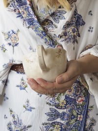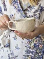 These chunky wobbly cups are made from stoneware and are wonderfully textured. Pinched into shape they show the marks of the maker (that’s me). Each one is decorated slightly differently with magnolia flowers and gold polka-dots and each one varies in size. Please look through the images on each listing to select the design you like most.